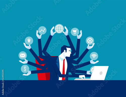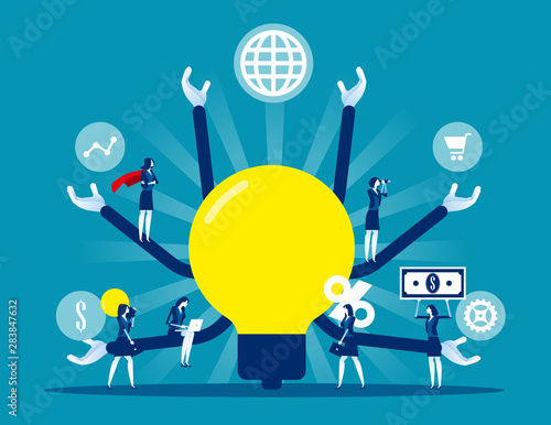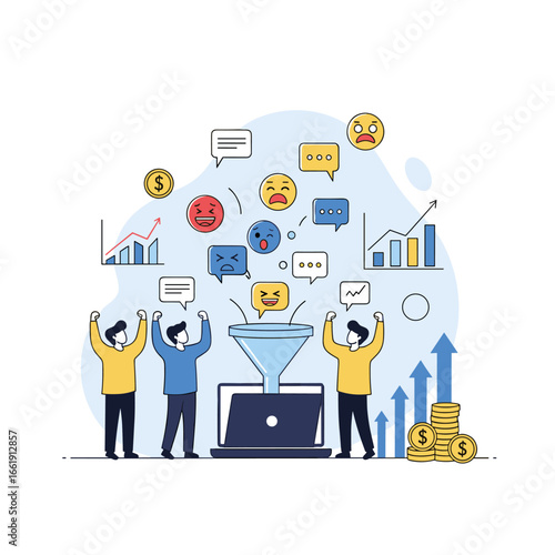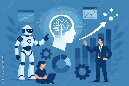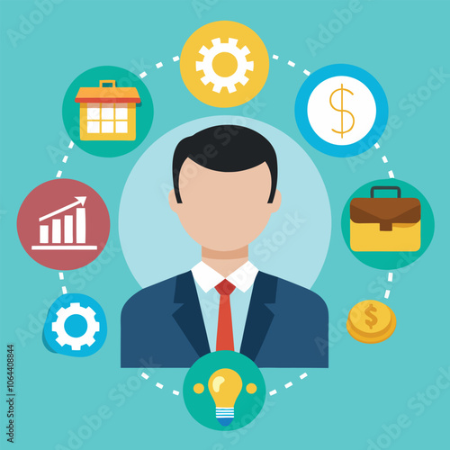 Векторная иллюстрация двух бизнесменов, разговаривающих друг с другом, и плоские значки бизнеса, элементы инфографики вокруг них.