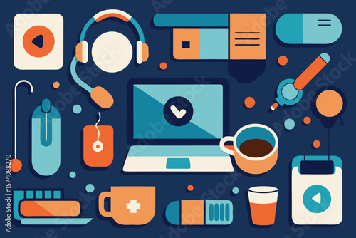 Векторная иллюстрация стиральной машины и аксессуаров для стирки в плоском стиле. Элемент дизайна интерьера ванной комнаты.