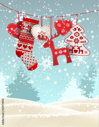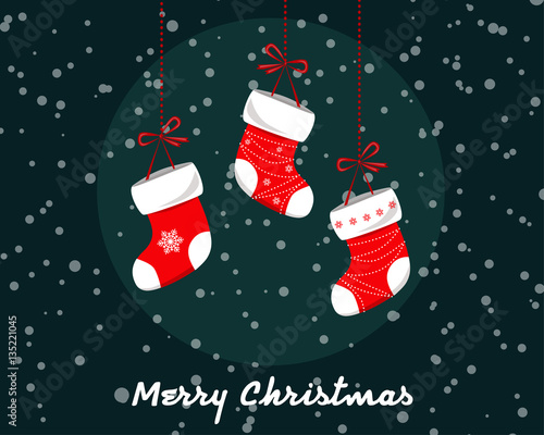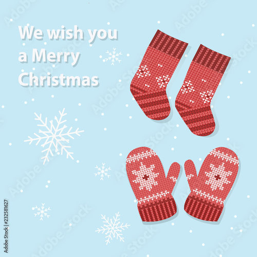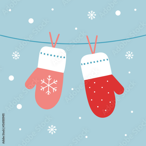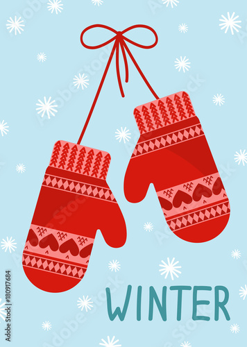 Векторная иллюстрация зимних вязаных варежек для девочек на зимнем снежном фоне. Открытка для зимних праздников в плоском стиле.