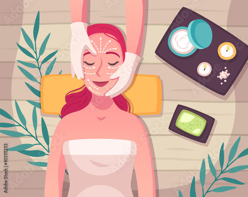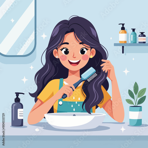 Векторная иллюстрация красивой женщины с длинными волнистыми волосами в купальнике. Концепция салона красоты и спа-салона в стиле комиксов ретро-поп-арта.