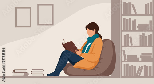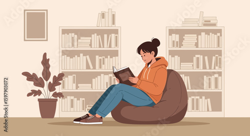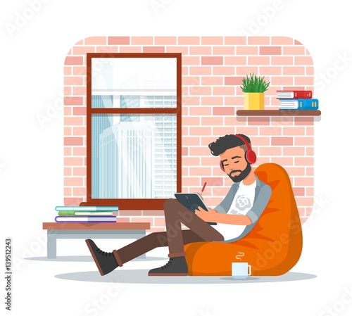 Векторная иллюстрация молодого человека, сидящего в кресле-мешке и использующего планшет. Интерьер рабочего места, мультяшный персонаж, дизайн в плоском стиле.