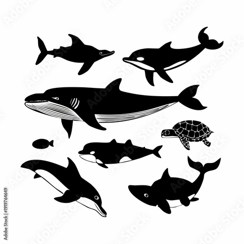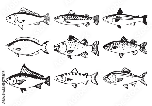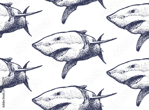 Набор значков акулы. Векторная иллюстрация, нарисованная от руки чернилами, изолированная на белом фоне.