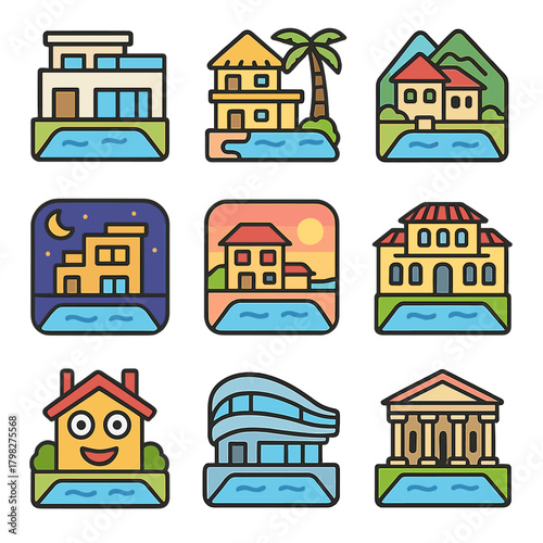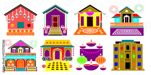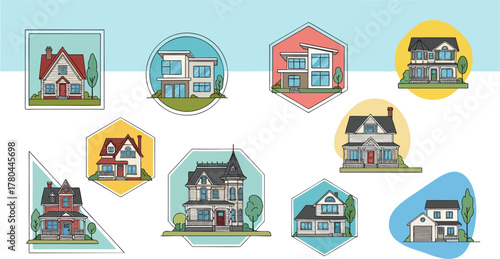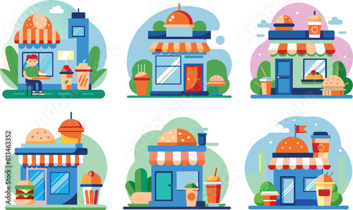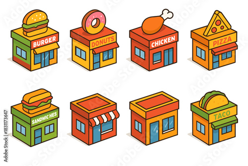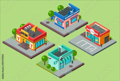 Набор значков здания городского магазина. Векторная изометрическая иллюстрация различных магазинов, изолированных на белом фоне. Внешний вид зданий магазина цветов и скобяных товаров для домашних животных.
