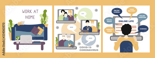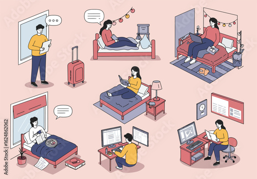 Плакат с изометрическим дроном, набор шаблонов баннеров. Векторная иллюстрация управляемых с помощью смартфона или контроллера квадрокоптеров, доставляющих посылку, аптечку первой помощи.