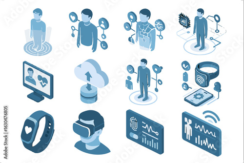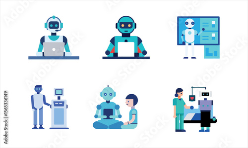 Набор иконок изометрической современной робототехники. Векторная изолированная иллюстрация. Бытовые, сервисные, промышленные роботы и роботы безопасности. Симпатичные гуманоидные роботы мужского и женского пола, робот-собака.
