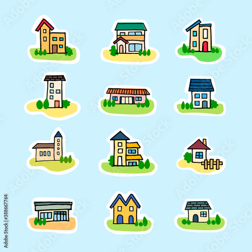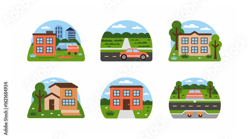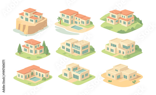 Набор значков здания общественного питания. Векторная изометрическая иллюстрация различных заведений общественного питания, кафе, магазина, внешнего вида зданий ресторанов. Пекарня, бургеры, пицца, кофе, хот-доги и азиатская кухня.