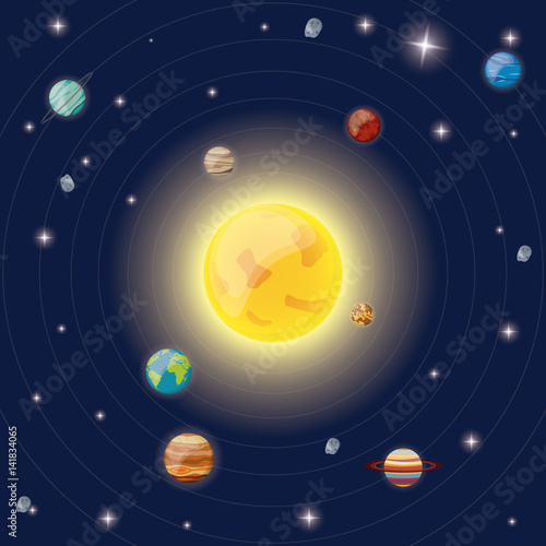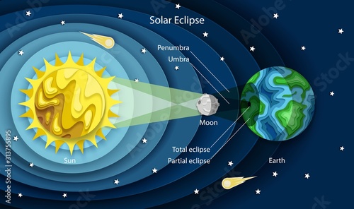 Векторная диаграмма солнечного затмения в стиле многослойной вырезки из бумаги. Шаблон образовательного плаката. Наука астрономия для детей.