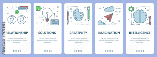 Векторный набор вертикальных баннеров с синхронизацией, распределенной базой данных, глобальной сетью, ошибкой подключения, отказом в доступе к веб-сайту и шаблонам мобильных приложений. Современный дизайн в плоском стиле с тонкой линией.