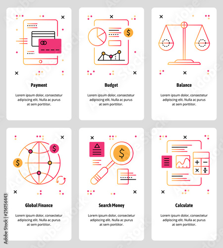 Векторный набор экранов для мобильных приложений. Оплата, Бюджет, Баланс, Глобальные финансы, Поиск денег, Расчет веб-шаблонов и баннеров. Иконки дизайна в стиле тонкой линии для меню веб-сайта.