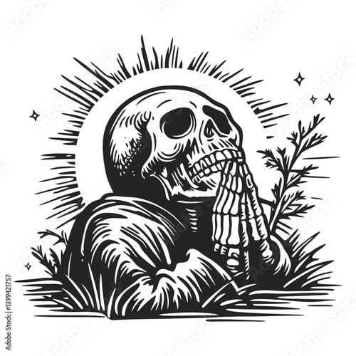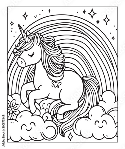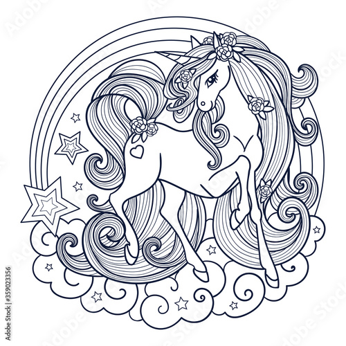Волшебная татуировка единорога или принт на футболке. Векторный эскиз головы единорога в сочетании с ночным небом, радугой, облаками, планетами.
