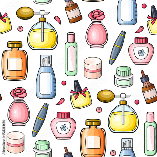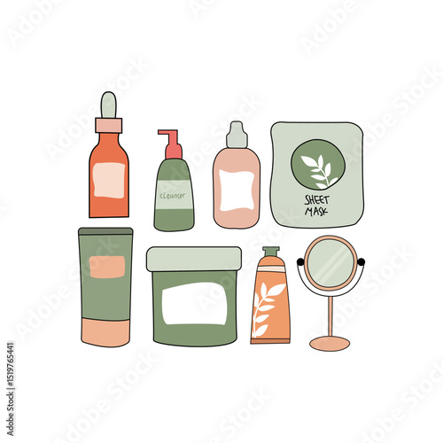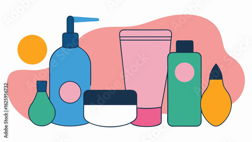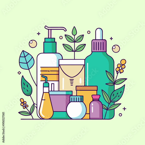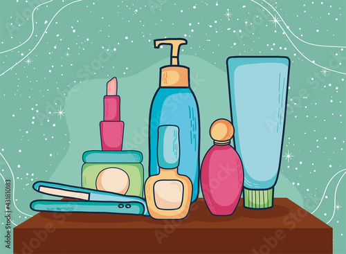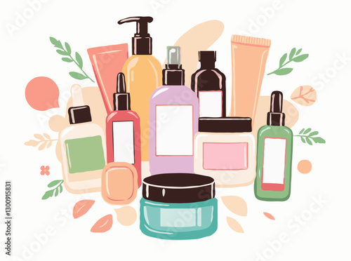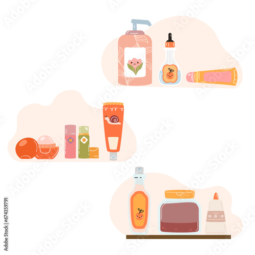 Вектор косметических средств для макияжа. Дизайн рекламного плаката для салона красоты. Тональный крем, тональная основа, палитра теней для век и лак для ногтей. Интернет-магазин, блог, предложения и концепция продвижения