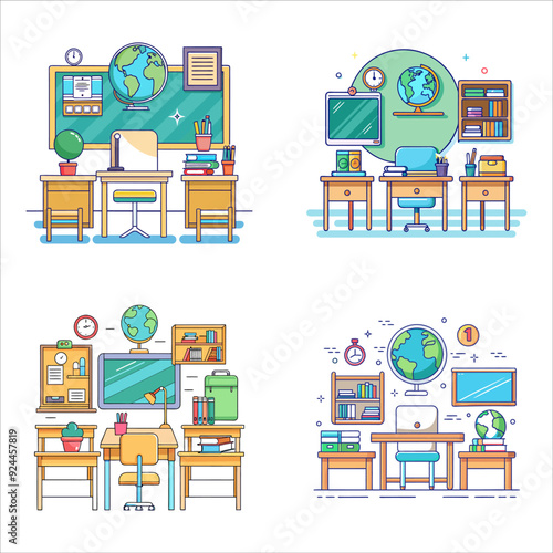 Векторный набор современных интерьеров рабочего пространства с офисной мебелью, офисной техникой и деловыми людьми, иллюстрация в плоском стиле.