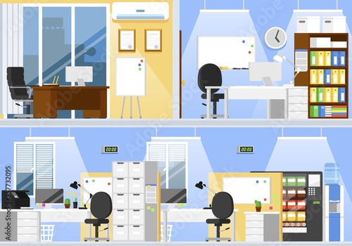 Векторный набор современных интерьеров рабочего пространства с офисной мебелью и оборудованием. Офисные работники в различных ситуациях, иллюстрация в плоском стиле.