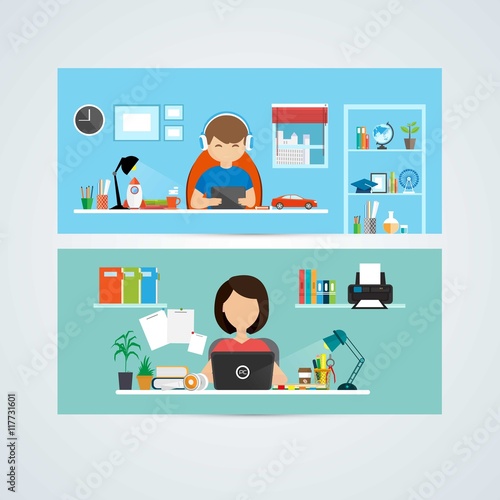 Векторный набор современных интерьеров рабочего пространства с офисной мебелью и офисным оборудованием. Деловые люди в офисе, в конференц-зале и в зале заседаний, иллюстрация в плоском стиле.
