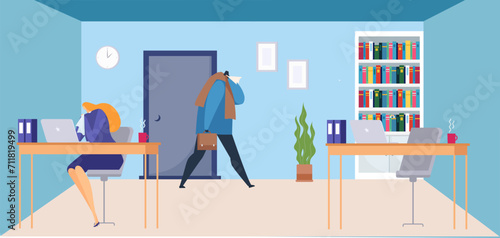 Векторный набор современных интерьеров рабочего пространства с офисной мебелью и оборудованием. Офисные помещения, стойка регистрации и рабочие места деловых людей, иллюстрация в плоском стиле.