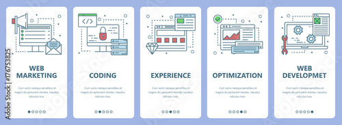 Векторный набор вертикальных баннеров концепции человеческих ресурсов. Анализ, Обучение, Стимулирование, Оценка, Вербовка веб-шаблонов. Современные элементы дизайна в стиле thin line art, иконки для меню сайта, печать.