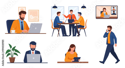 Векторный набор иконок персонажей офисной команды. Люди, пользующиеся ноутбуками и работающие с документами. Элементы дизайна в плоском стиле, выделенные на белом фоне.