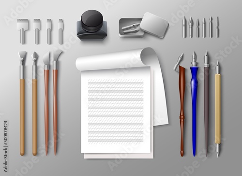 Коллекция каллиграфии. Векторная старая чернильная авторучка с наконечниками и набором инструментов для письма. Основы каллиграфии и художественные принадлежности иллюстрация