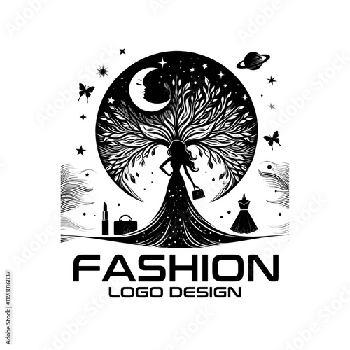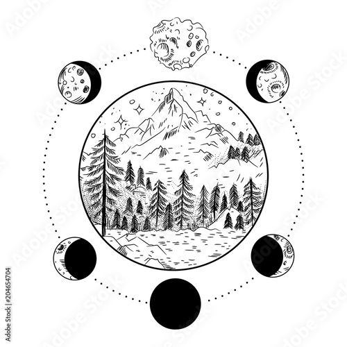 Векторная татуировка птицы или дизайн принта на футболке. Голова совы в сочетании с природой в круглой рамке с фазами луны.