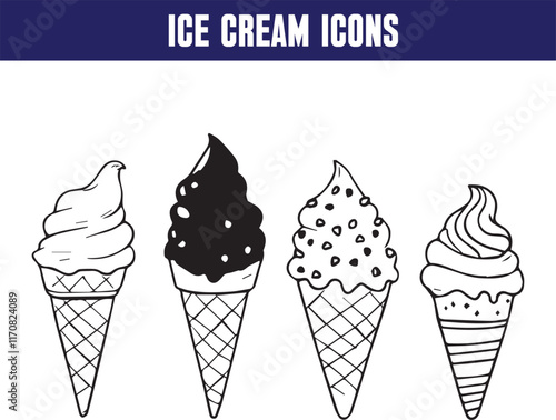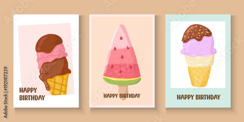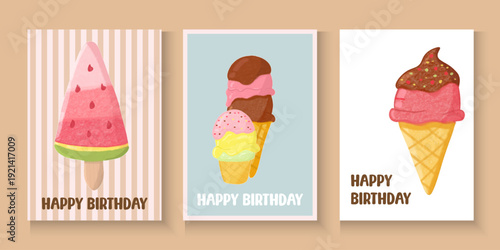 Набор вертикальных баннеров для мороженого в стиле векторного бумажного искусства. Вкусные рожки для мороженого в ярких цветах на фоне лета. Шаблоны дизайна рекламы мороженого.