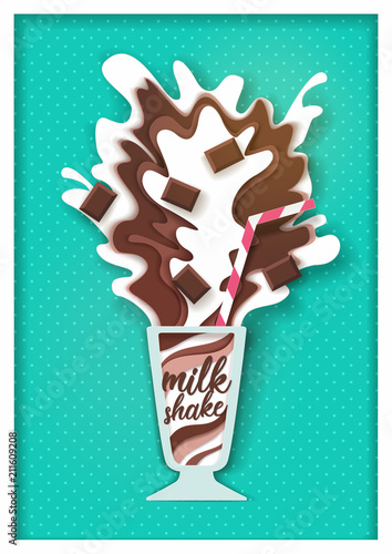 Молочный коктейль со вкусом шоколада. Векторный бумажный граненый стакан взбитого молочного напитка со льдом с шоколадом, молочными брызгами шаблон дизайна для рецепта, меню, баннера, листовки, плаката и т.д.
