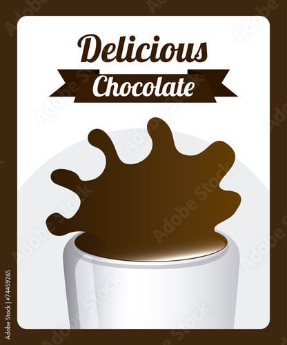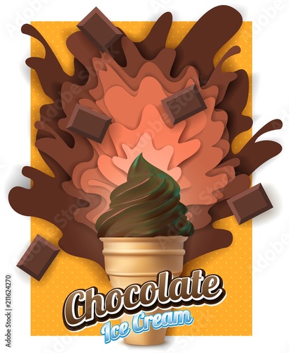 Шаблон дизайна плаката с шоколадным мороженым. Векторный вырезанный из бумаги рожок мороженого с брызгами расплавленного шоколада и кусочками шоколада.