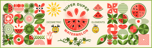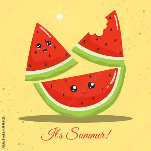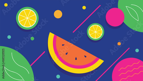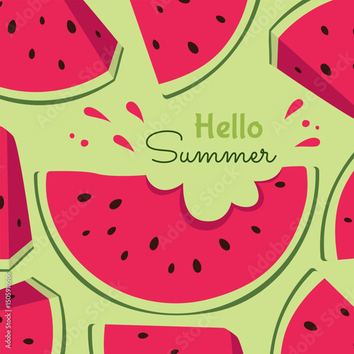 Векторная вырезанная из бумаги цветочная рамка в стиле ремесла с вкусными летними фруктами. Креативная летняя кулинарная композиция из ломтика сладкого арбуза и тропических фруктов на зеленом фоне.