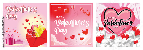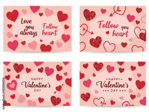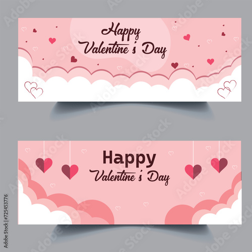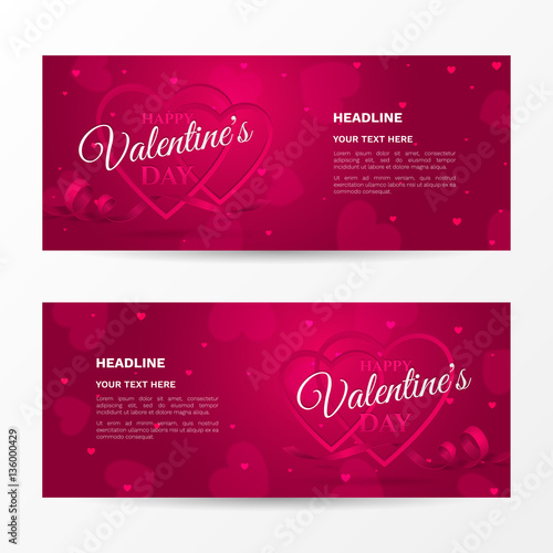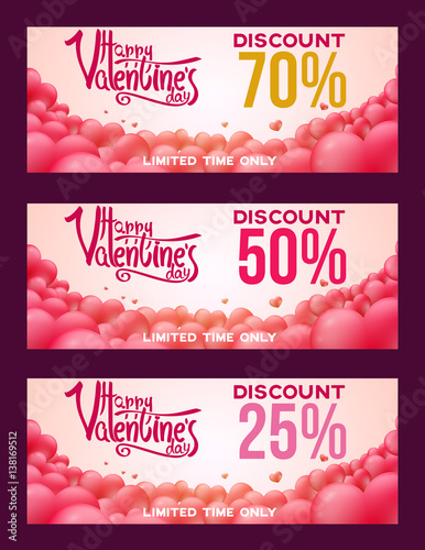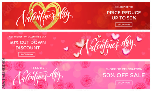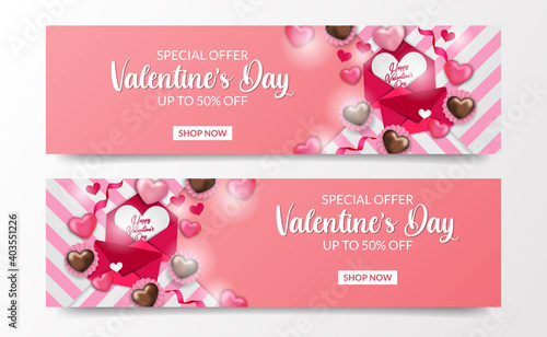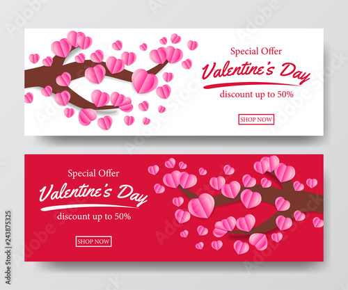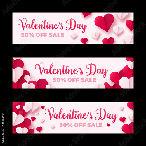 Набор шаблонов веб-баннеров с Днем Святого Валентина и специальным предложением. Вырезанные из векторной бумаги розовые и красные сердечки и розы. Рекламные горизонтальные баннеры распродаж и скидок.