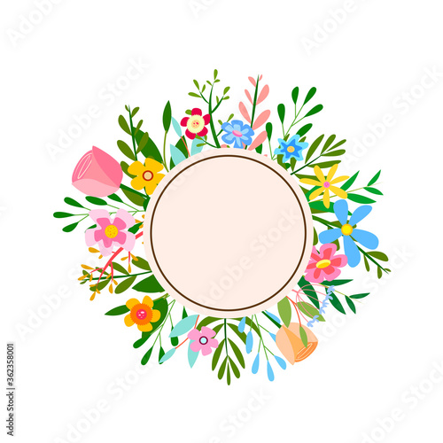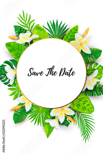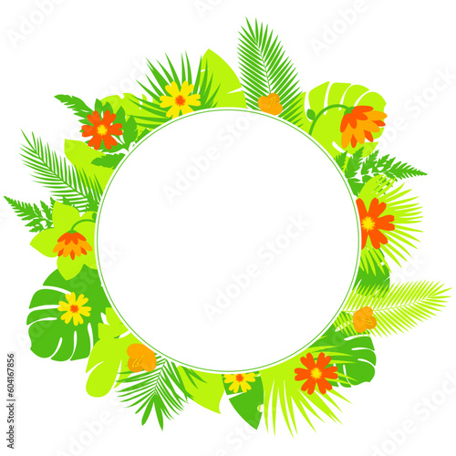 Тропический коктейль летний напиток в круглой оправе. Векторная вырезанная из бумаги иллюстрация красивых экзотических тропических цветов, пальмовых листьев и коктейлей.