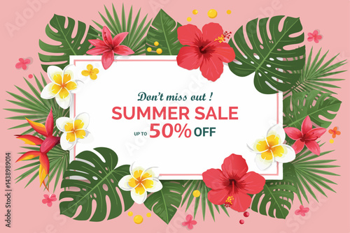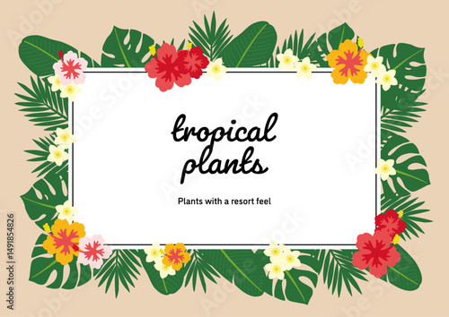 Рамка с тропическим цветком. Векторная вырезанная из бумаги декоративная летняя рамка с красивыми экзотическими тропическими цветами, пальмовыми листьями.