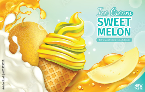 Шаблон дизайна плаката с тропическим фруктовым мороженым. Векторный бумажный рожок для мороженого с брызгами фруктового сока и свежими ломтиками киви, лайма, манго, апельсина.