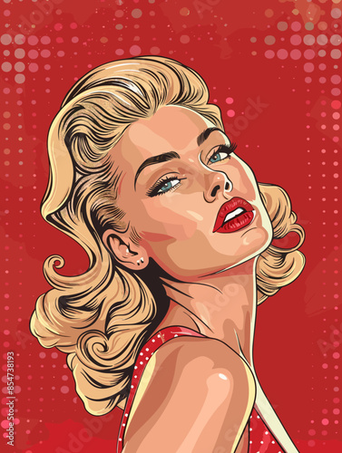 Векторная иллюстрация красивой молодой женщины с красной розой. Сексуальная девушка в стиле ретро-поп-арт в стиле комиксов.