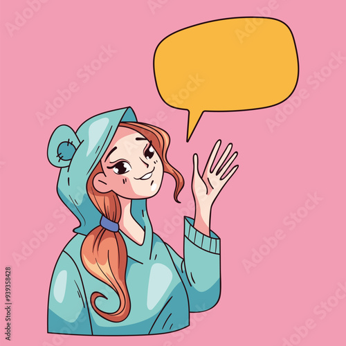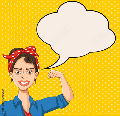 Векторная иллюстрация красивой женщины, указывающей пальцем, речевой пузырь. Молодая девушка жестикулирует в стиле комиксов ретро-поп-арта.
