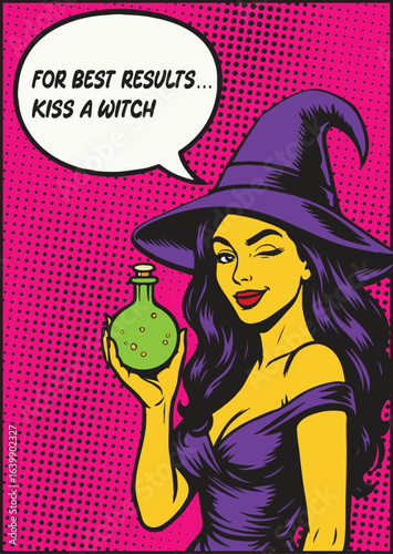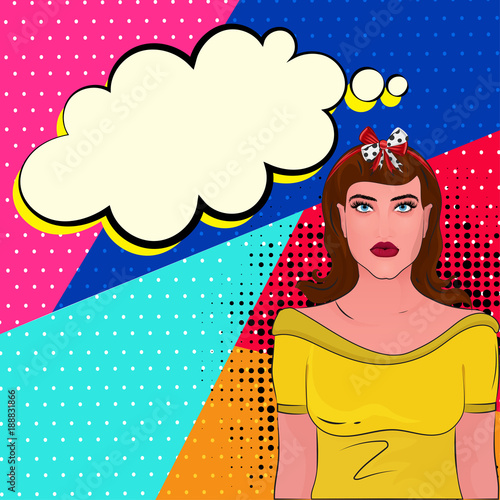 Векторная иллюстрация симпатичной молодой девушки в шляпе от солнца и солнцезащитных очках, речевой пузырь. Женщина с жестом открытой ладони в стиле комиксов ретро-поп-арта.