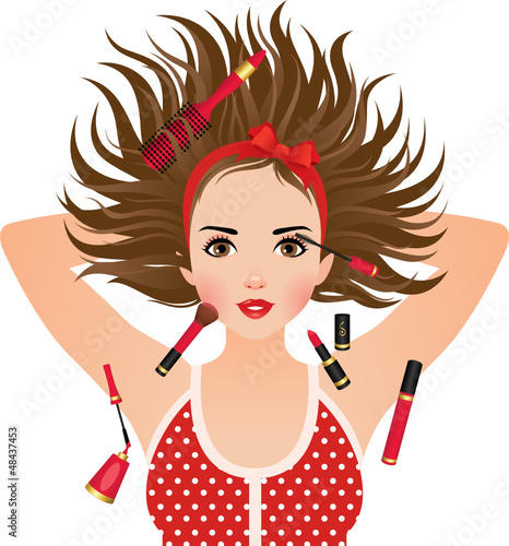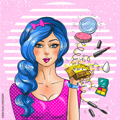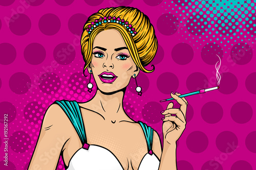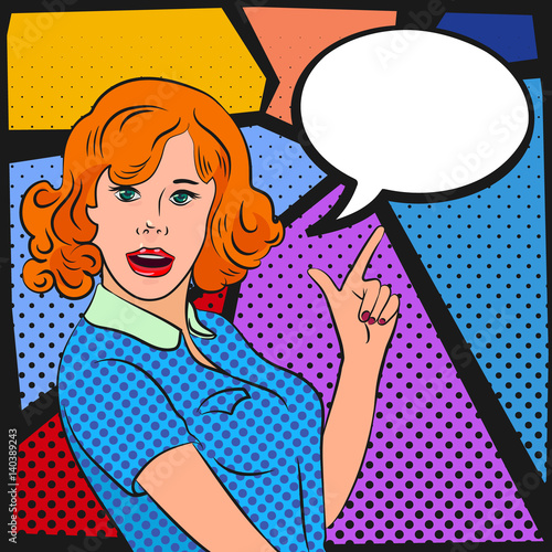Векторная иллюстрация красивой женщины, держащей смартфон с человеческой рукой, указывающей жестом руки. Комический стиль ретро-поп-арта.