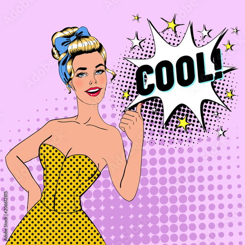 Векторная иллюстрация молодой женщины, демонстрирующей мышцы, речевой пузырь. Портрет красивой девушки в стиле комиксов ретро-поп-арта.