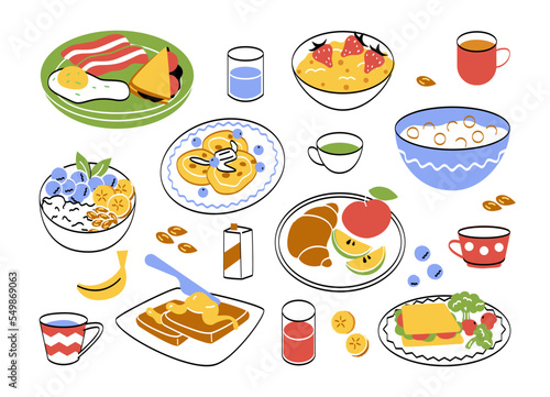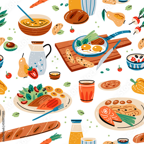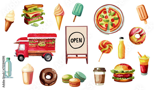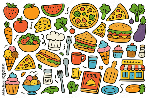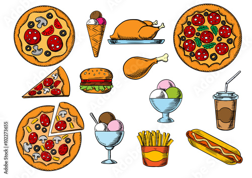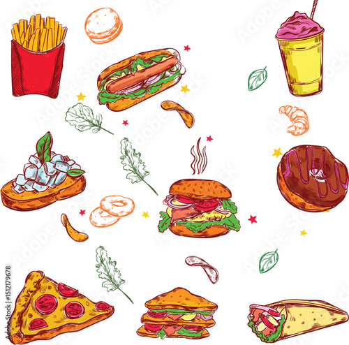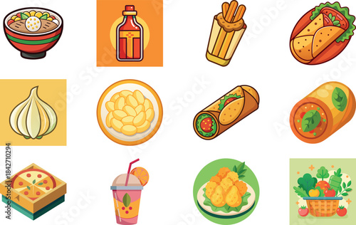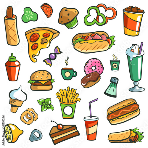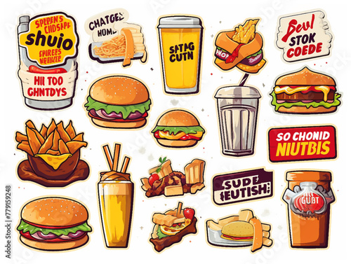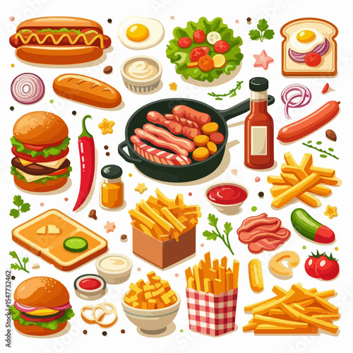 Векторные модные патчи в стиле поп-арт с едой. Жареная курица, салат, хлеб, торт, кетчуп, соус и т.д. в стиле ретро-комиксов.