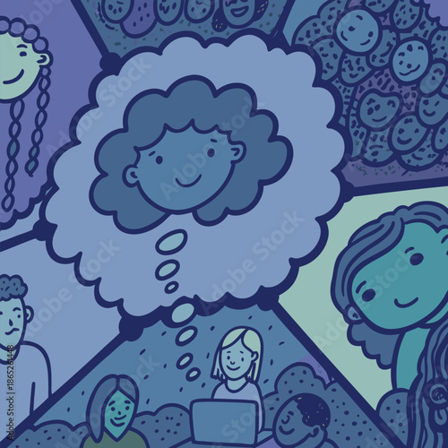 Векторная иллюстрация молодой девушки, стоящей в стороне, и пиона, цветов незабудок вокруг нее в стиле комиксов ретро-поп-арта.
