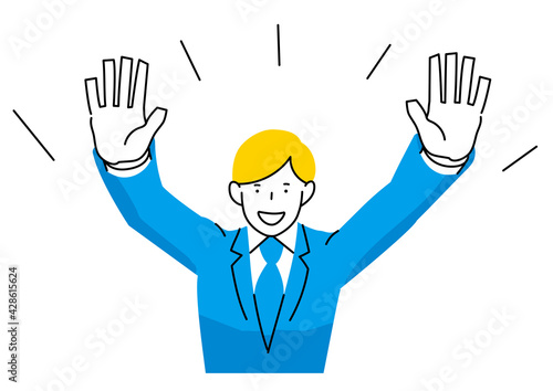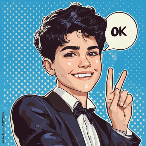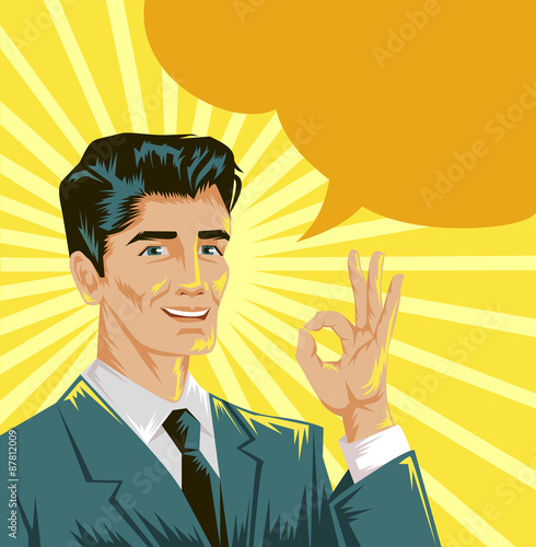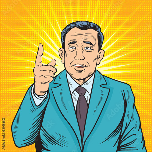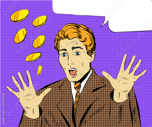 Векторная иллюстрация изумленного бизнесмена с поднятыми руками, речевой пузырь. Удивленный мужчина в стиле ретро-комиксов поп-арта.