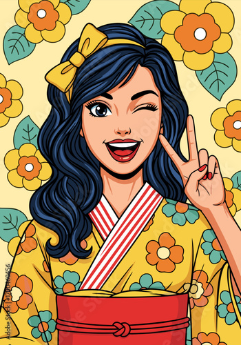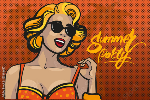 Векторная иллюстрация красивой блондинки в 3d-очках с попкорном и содовой или колой. Кинотеатр или афиша кинотеатра в стиле комиксов ретро-поп-арта.