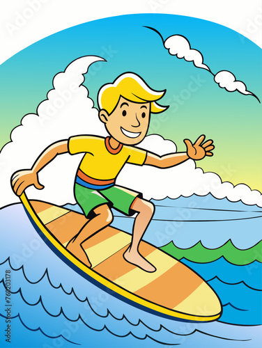 Векторная иллюстрация молодого человека, стоящего на доске для серфинга и катающегося на океанской волне, речевой пузырь. Элемент дизайна концепции водных видов спорта в стиле комиксов ретро-поп-арта.