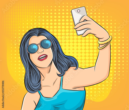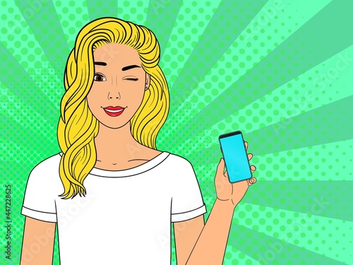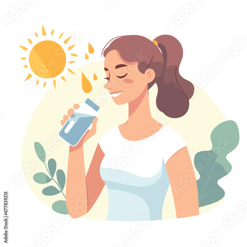 Векторная иллюстрация счастливой улыбающейся спортивной девушки или инструктора по фитнесу со спортивной бутылкой воды. Портрет симпатичной молодой женщины в стиле комиксов ретро-поп-арта.