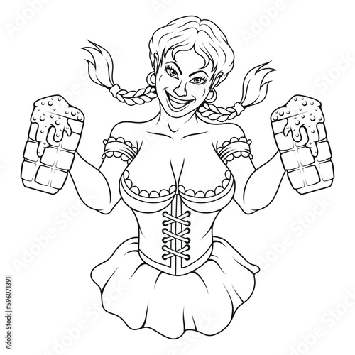 Векторная иллюстрация симпатичной девушки-официантки с пивом и рыбой. Концепция пивного фестиваля Октоберфест в стиле комиксов ретро-поп-арта.
