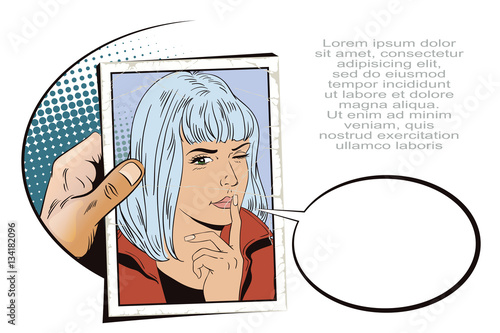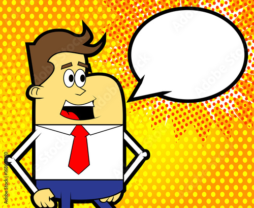 Векторная иллюстрация человека с праздничным жестом, речевой пузырь. Счастливый бизнесмен показывает жест кулаком в стиле комиксов ретро-поп-арта.