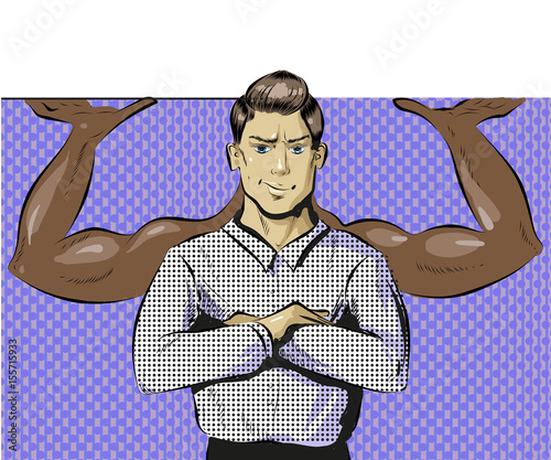 Векторная иллюстрация бизнесмена с жестом власти или человека, мечтающего о сильном мускулистом теле. Комический стиль ретро-поп-арта.