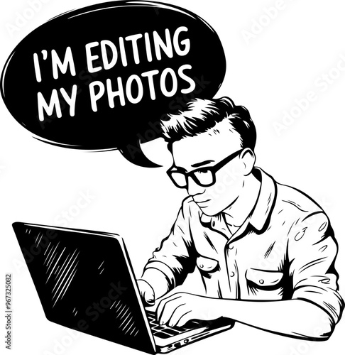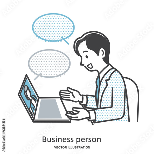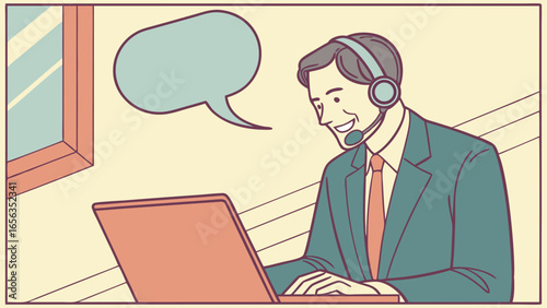 Векторная иллюстрация человека, использующего ноутбук и разговаривающего по мобильному телефону в стиле комиксов ретро-поп-арта. Речевой пузырь.