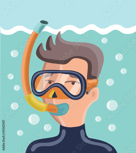 Векторная иллюстрация плавающего подводного человека в снаряжении для подводного плавания с аквалангом, показывающая знак "ок". Мужчина-дайвер в стиле комиксов ретро-поп-арта.