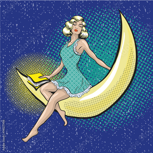 Векторная иллюстрация красивой женщины, сидящей на полумесяце. Мечтающая девушка с книгой в стиле комиксов ретро-поп-арта.