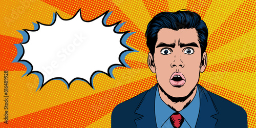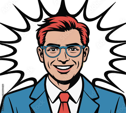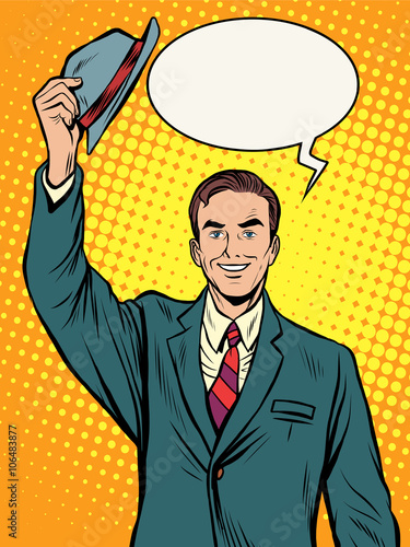 Векторная иллюстрация бизнесмена-риэлтора, предлагающего недвижимость продавцам, покупателям. Аренда дома. Концепция услуг агента по недвижимости в стиле комиксов ретро-поп-арта.
