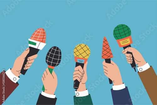 Векторная иллюстрация микрофонов, смартфона и диктофона в руках репортеров. Пресс-конференция или интервью, речевые пузыри в стиле комиксов ретро-поп-арта.